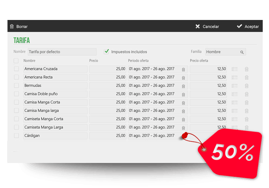 Consigue que tu negocio prospere día a día con la gestión de los períodos de oferta. Crea tarifas especiales y establece períodos de ofertas acordes con tu política comercial. Aumenta tus ventas y potencia la relación con tus clientes.
