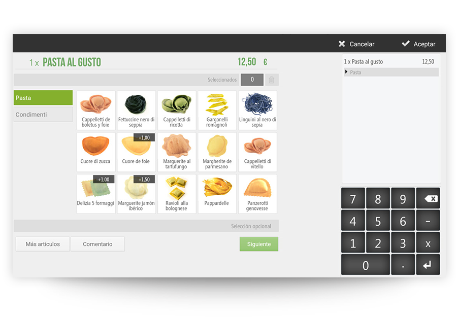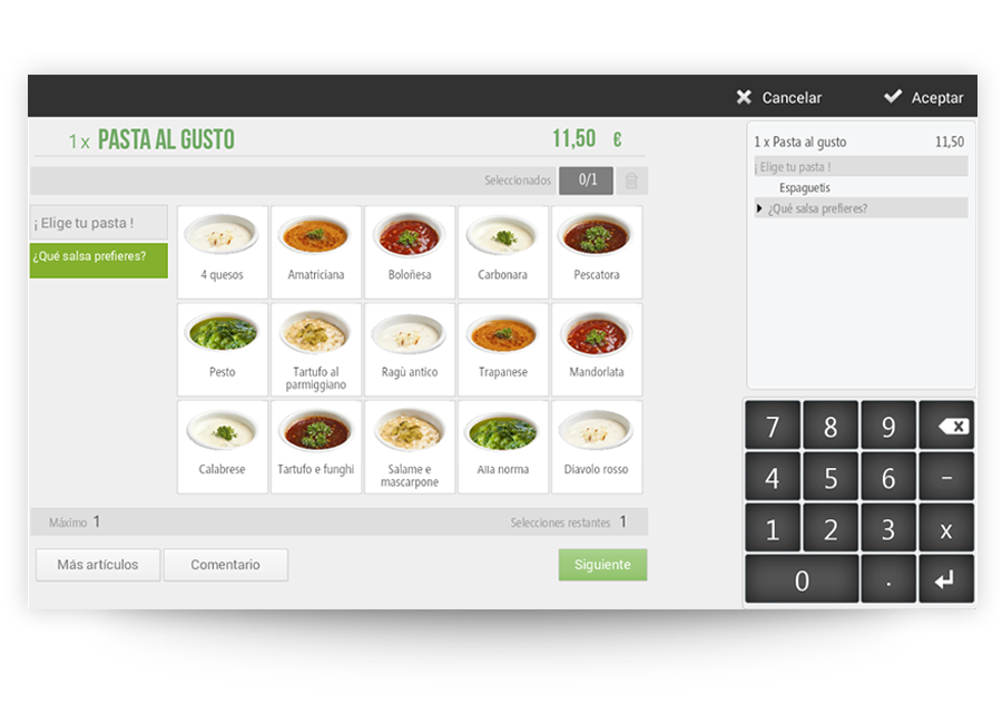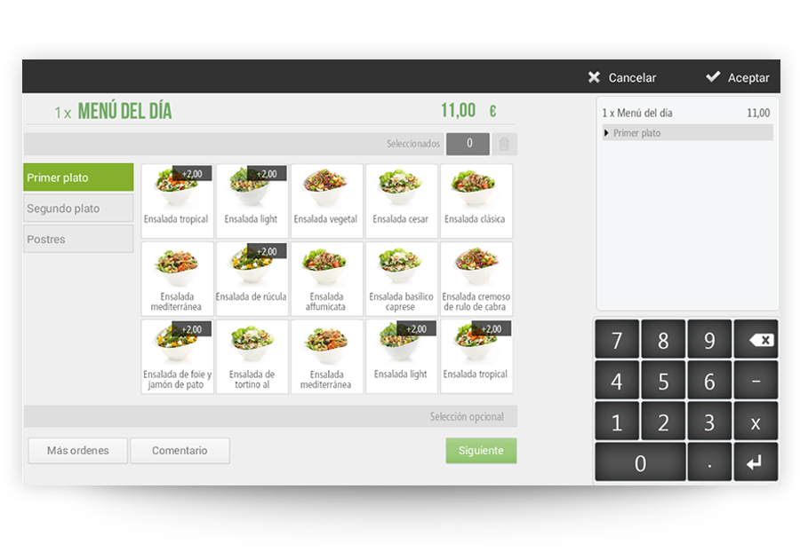 Ayuda al camarero a registrar el pedido proponiéndole modificadores personalizados pre-configurados para cada producto, como sería para las carnes el tipo de cocción.