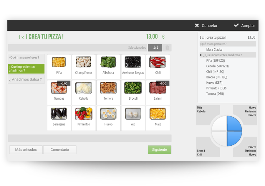 Con HIOPOS configura las pizzas por porciones, medias pizzas, cuartos… y asígnales modificadores para personalizar la elaboración. Podrás asignar modificadores en la parte superior, inferior, izquierda o derecha de las pizzas. Podrás añadir comentarios y acotar al máximo las exigencias de los clientes.
