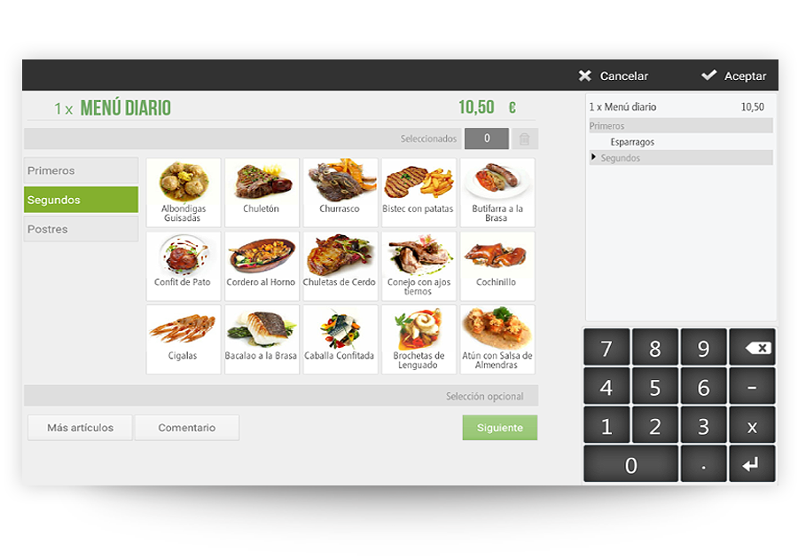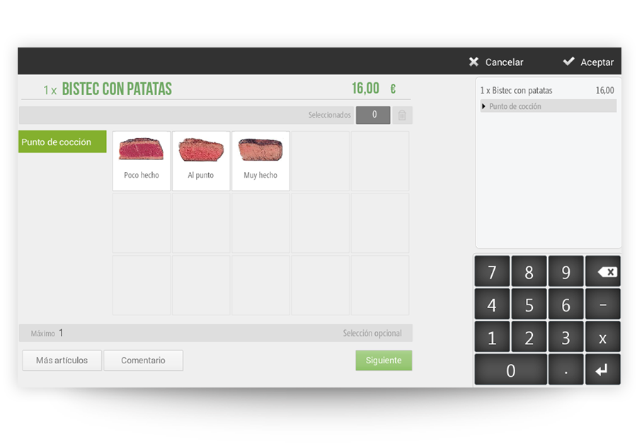 Ayuda al camarero a registrar el pedido proponiéndole modificadores personalizados pre-configurados para cada producto, como sería para las carnes el tipo de cocción.