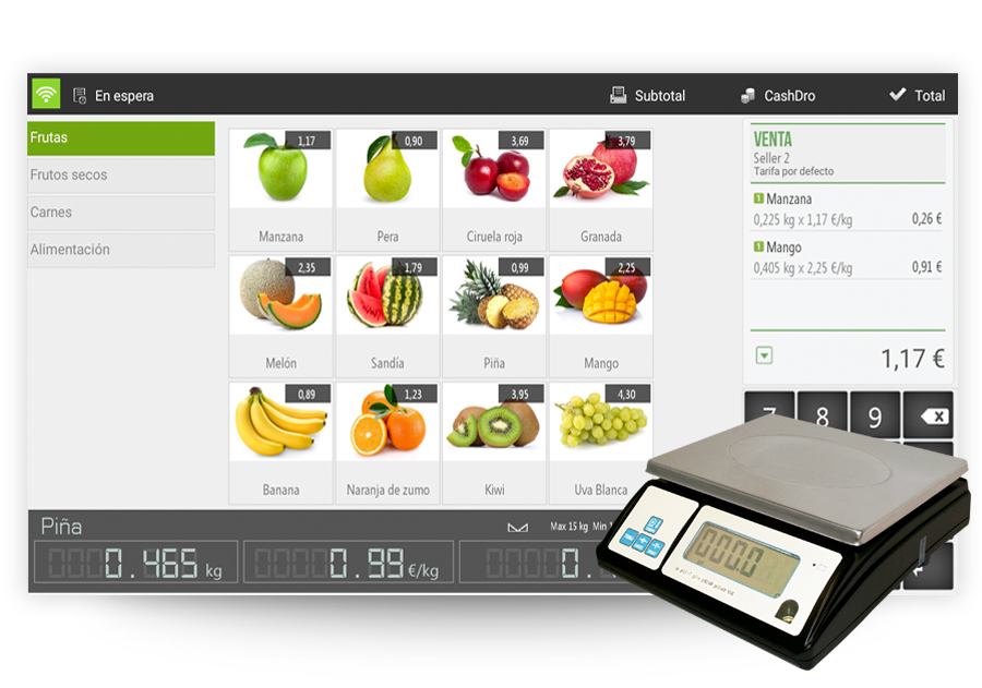 Enlaza HIOPOS con tus balanzas y automatiza la venta de tus productos por peso. Configura los productos que quieres vender por peso y asígnales un precio por kilo para que HIOPOS te calcule automáticamente el precio a pagar.